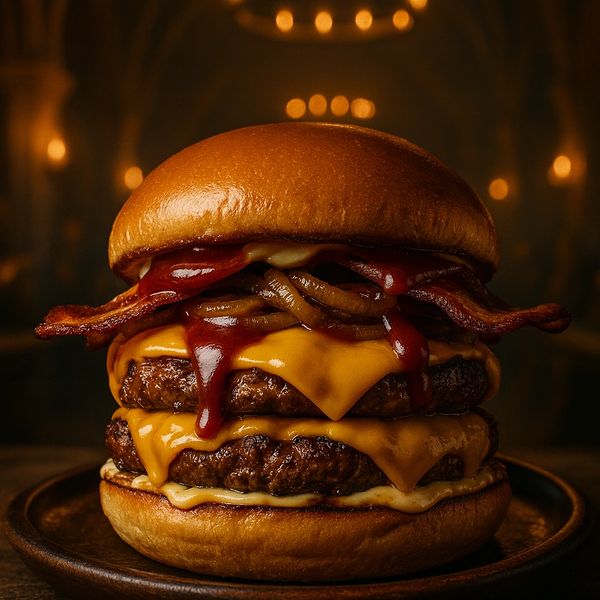 Doble carne, queso americano, cebolla BBQ y tocineta ahumada. Un clásico fuerte y noble, digno de caballeros.