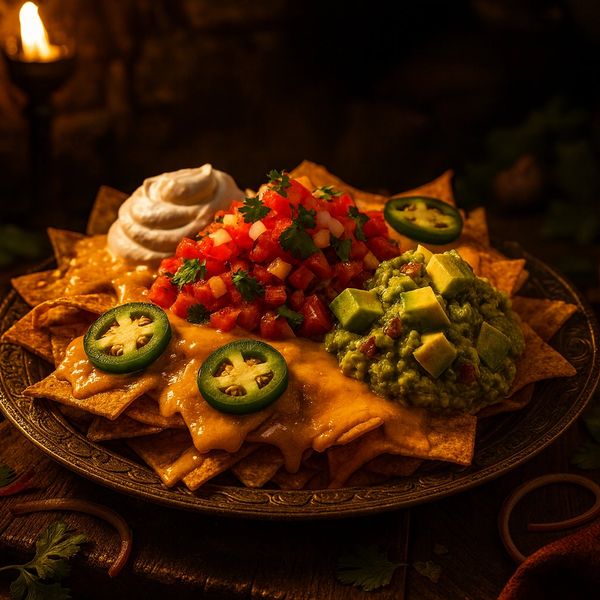 Totopos de maíz rebosantes de queso fundido, pico de gallo fresco, guacamole, crema ácida y opción de jalapeño. El festín compartido del pueblo en cada mesa.